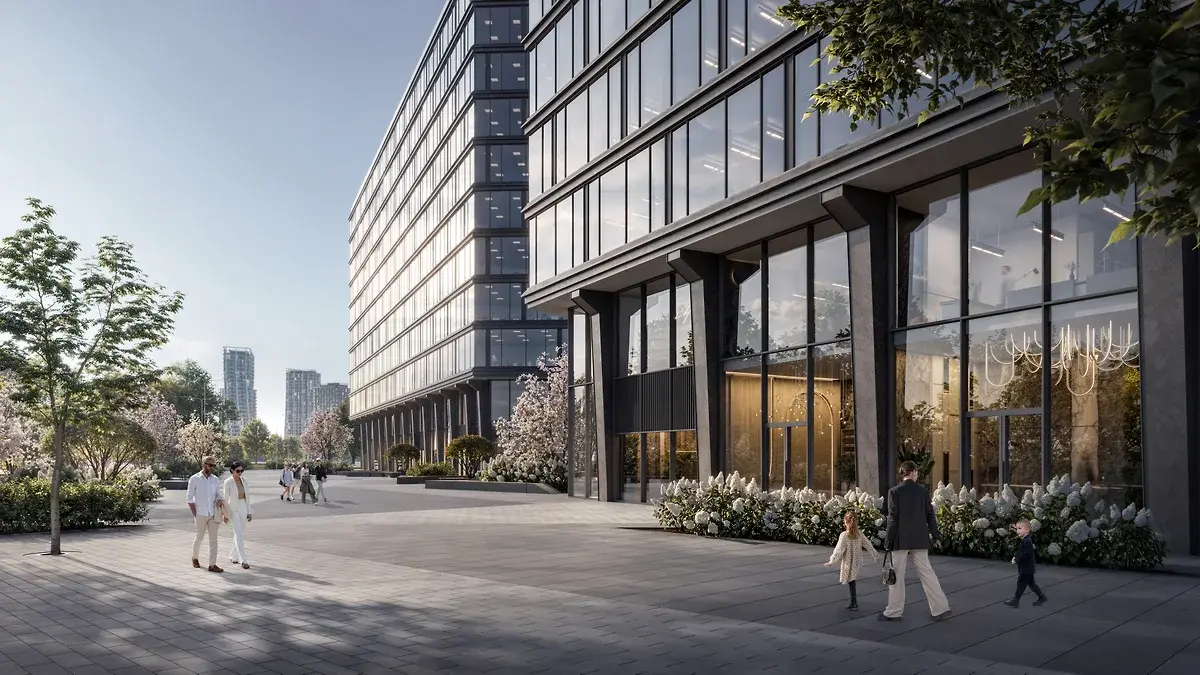 Архитектуру второй очереди бизнес-центра, как и первой, разработало бюро Kleinewelt Architekten. Офисное здание в виде стеклянной башни со сквозной аркой станет продолжением офисного ансамбля на берегу реки и соединит территорию бизнес-центра с городской благоустроенной набережной. Завершить строительные работы на площадке второй очереди девелопер планирует в 2029 году.