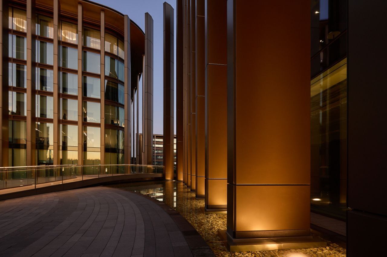Комплекс расположен в окружении ландшафтного парка площадью 9 гектаров. Ключевым преимуществом стилобатной части двух новых корпусов является их панорамный вид на искусственное озеро площадью три тысячи квадратных метров и живописные зоны отдыха. Уже известно, что арендаторами этих лотов станут рестораны.