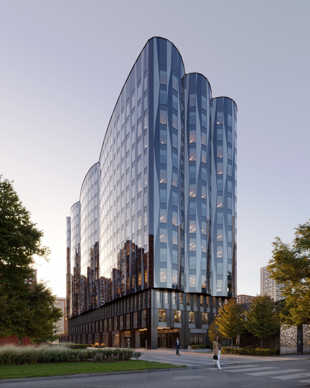 Архитектурную концепцию разработало бюро PANACOM. Образ фасада вдохновлен поэтикой воды, динамика линий и мягкая пластика отражают движение ветра и волн. Трехэтажная стилобатная часть формирует «ватерлинию», визуально поддерживая легкий парусный объём башни. В отделке применяются алюминиевые панели, стекло и стемалит, создающие эффект живого отражения неба и городской среды.