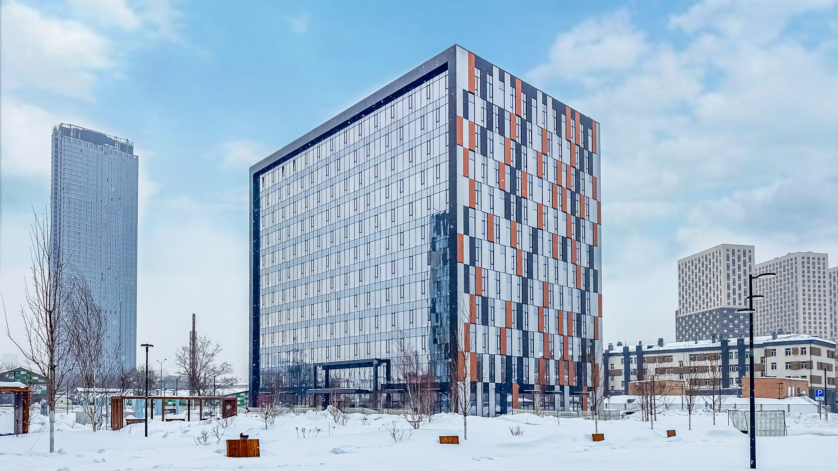 Корпус площадью 22 635 кв. м включает 132 современных офиса, а также просторное двухсветное лобби с уютной зоной ожидания, ресепшн и несколькими переговорными комнатами. Он стал последним из шести построенных 12-этажных зданий бизнес-парка OSTANKINO, спроектированного российским бюро UNK project. Панорамное остекление открывает виды на Останкинскую телебашню, ВДНХ и Главный ботанический сад. Фасады украшены акцентными панелями бла городных оттенков золота, бронзы и меди, что придает каждому корпусу неповторимый и лаконичный облик.